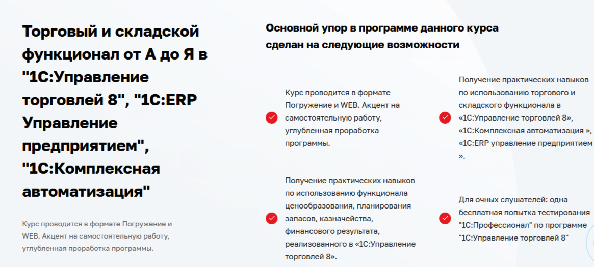 Курс предназначен: для сотрудников компаний, использующих торговый и складской функционал в «1С:ERP Управление предприятием », «1С:Комплексная автоматизация » или работающих в конфигурации «1С:Управление торговлей 8», внедренцев (сотрудников фирм-франчайзи, IT служб компании). Помимо торгового и складского функционала рассматриваются возможности разделов «Казначейство», «Ценообразование», «Планирование» и «Финансовый результат».